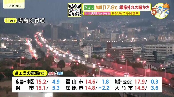 きょう19日(月)の広島県内は、よく晴れて気温が上昇し、各地で3月中旬~4月上旬並の暖かさになりました。最高気温は、加計で17.9℃まで上がり、広島市中区15.2℃でした。