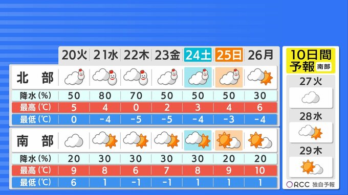 【あす1/20(火)広島天気 】雲が優勢 北部では雪も 気温急降下 防寒対策しっかりと 2026年1月19日(月) 19:41 国内 天気 今週は寒波襲来 影響長期化 あす以降、強い寒気の影響で北部を中心に断続的に雪が降り、南部でも雪が降る所があるでしょう。寒波の影響は長期化し、低温状態が続くため、体調管理にはくれぐれもご注意ください。北部を中心に積雪や路面の凍結に注意が必要です。