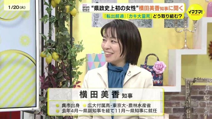広島県の横田美香知事は20日、RCCのスタジオを訪れ「イマナマ!」の生放送に出演しました。就任から2ヶ月が経とうとするなか、県政課題への取り組みや、知事として2026年にかける思いを番組MCの青山高治アナウンサー、中根夕希アナウンサーに語りました。