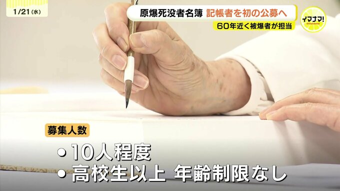 新たに一般から募集するのは10人程度で、若い人も含めた幅広い世代を対象とするため高校生から、上は年齢制限なしで応募できます。募集期間は1月28日から2月27日で、広島市職員や中本さんたち記帳者が審査員として、毛筆の実技や面接で、選考するということです。