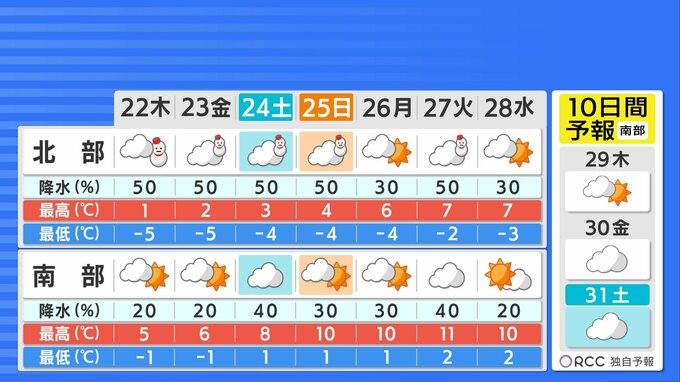 【あす1/22(木)広島天気 】長期寒波ピークに 山地まとまった雪の予想 南部でも雪 2026年1月21日(水) 19:13 国内 天気 長期寒波 影響長引く 日曜日頃まで積雪・凍結注意 寒波の影響は日曜日頃まで続き、北部を中心に断続的に雪が降り、南部でも雪が降る所があるでしょう。長期間低温状態が続くため、体調管理にはくれぐれもご注意ください。
