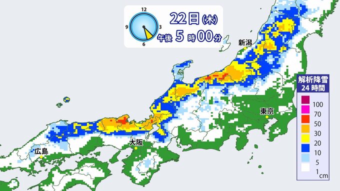気象庁によりますと、25日頃にかけて強い冬型の気圧配置が続き、北日本から西日本の日本海側を中心に、山沿いや山地だけではなく平地でも大雪となる所がありますので、大雪・路面凍結による交通障害に注意・警戒してください。近畿地方では引き続き22日は、北陸地方と東海地方では24日にかけて大雪に警戒してください。