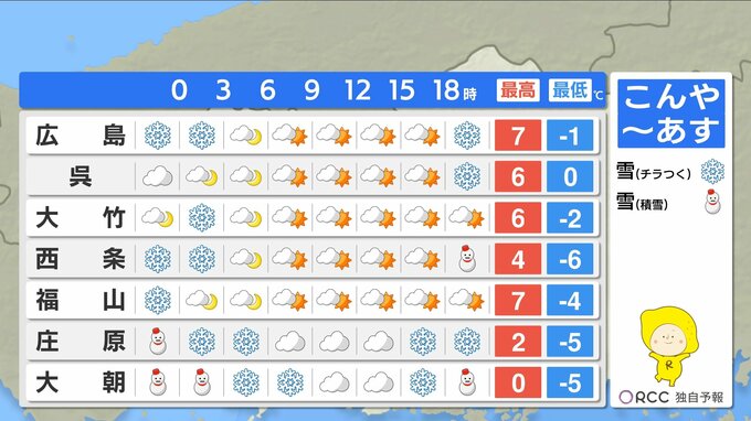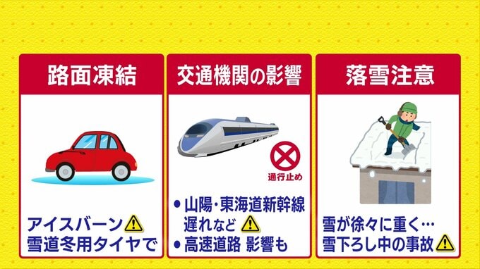 あすの朝は氷点下の冷え込みが続き、積雪している所では路面状況の悪化に注意が必要です。路面凍結による交通事故にご注意ください。また、低温状態が続いているため、徐々に雪が重くなってしまいます。雪が残っている所では、屋根からの落雪に注意が必要です。