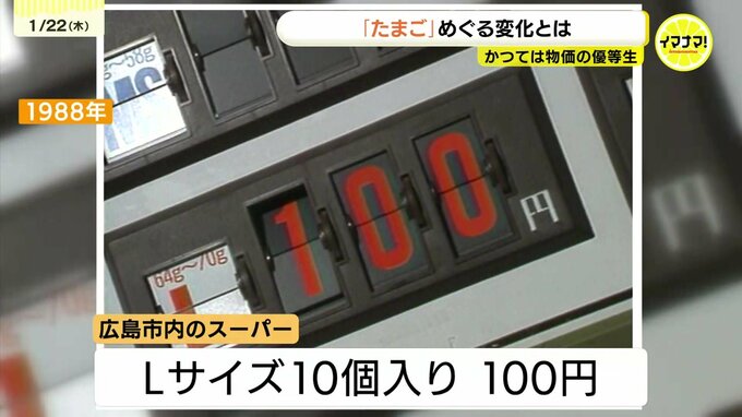 約40年前、同じ広島市内のスーパーではLサイズ10個入りが「100円」で売られていました。店舗によっては、安い時に50円〜60円というケースもあり、まさに物価の優等生でした。