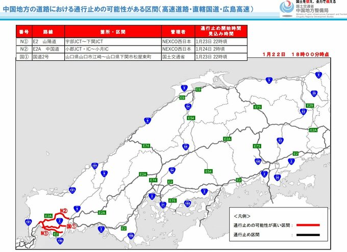 中国地方の高速道路と主要国道のうち、通行止めの可能性がある区間は次の通りです。(22日午後6時発表)