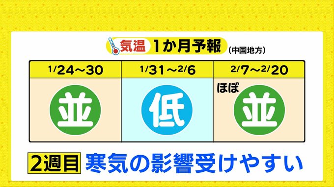 1週目(1月24日~30日)はおおむね平年並で、この時期らしい気温が続きますが、2週目(1月31日~2月6日)は気温が平年より低くなる見込みで、再び寒気の影響を受けやすい時期があるでしょう。短期間に気温変化が大きくなっています。体調管理にはご注意ください。