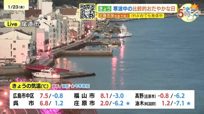 【1/24・25(土日)広島天気】土曜の午前中は寒波のピークで雪強まる 沿岸部でも積雪 冬用タイヤ必須 日曜は雪は弱まり南部で晴れ間 2026年1月23日(金) 18:51 国内 天気 今日23日(金)の広島県内は、寒波中でも比較的穏やかな天気となり、南部では日差しが届きました。日差しがあっても暖かさは感じにくく、最高気温は、広島市中区で7.5℃、庄原市高野町では-0.8℃、1日通して氷点下の真冬日となりました。