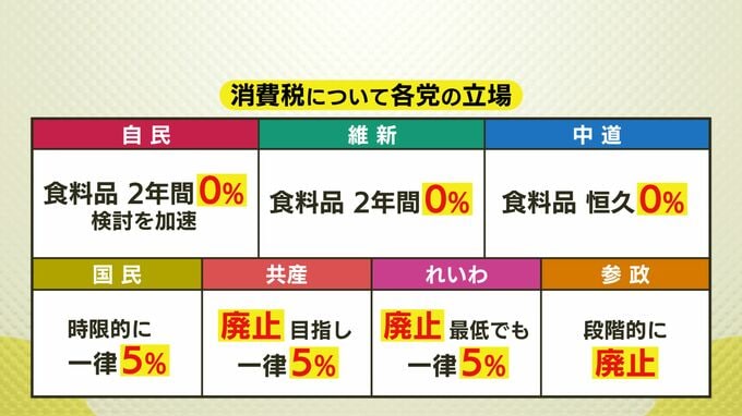 この物価高への対策として、各政党は消費税についてこのように表明しています。