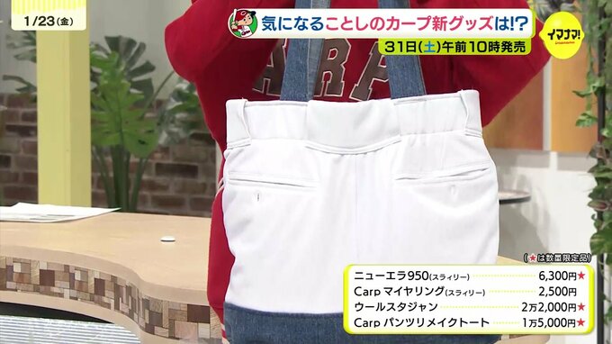 (田村友里アナ)私もグッズを身に纏ってみました。 まずご紹介するのがこちらのバッグ。実はこれユニフォームのパンツをリメイクしたものなんです。