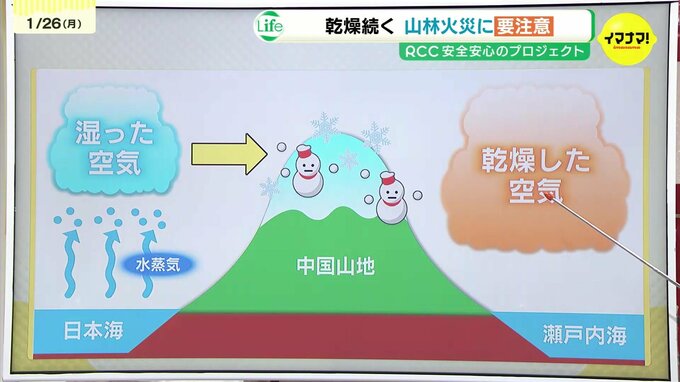 この時期気になる乾燥…冬に空気がカラカラになる原因のひとつが雪です。冬場は、日本海から水蒸気を含んだ空気が、中国山地など山ににぶつかって雪を降らせます。その後、乾燥した空気が山を越えて流れ込むため、瀬戸内側や太平洋側は、乾燥するのです。広島県の南部には、1月はほぼ毎日、乾燥注意報が発表されています。