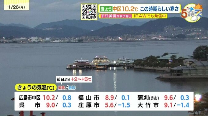 きょう26日(月)の広島県内は、明け方まで雪が残った所もありましたが、日中は日差しが届きました。最高気温は、広島市中区で10.2℃まで上がり、きのうまでの寒さと比較すると、寒さは和らいでいます。