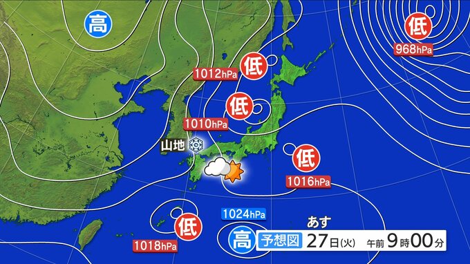 27日(火)南部では晴れ間 北部は雲が優勢 山地では雪 この時期らしい寒さに