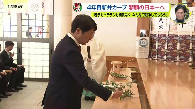 その悔しさを胸に今シーズンこそ、セ・リーグの頂点、そして、42年ぶりの日本一を祈り、新井監督と松田オーナー代行が代表して玉ぐしを奉納しました。