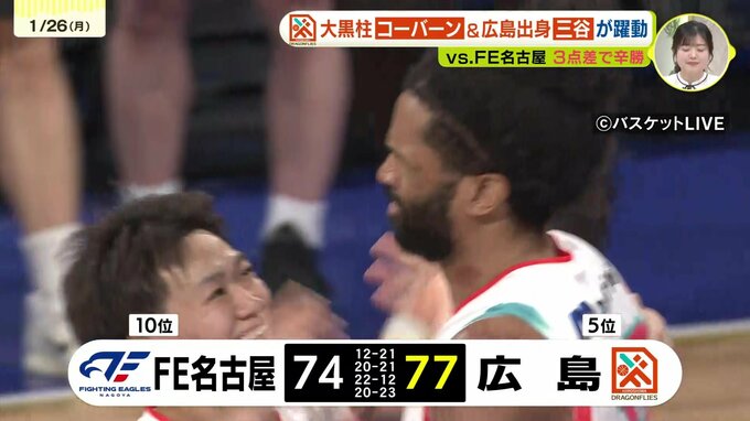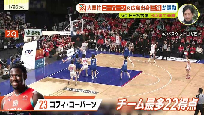 翌25日(日)の第2戦。連敗を避けたい広島は、序盤からビッグマンのコーバーン選手が攻守で圧倒します。豪快なダンクで会場のボルテージを上げると、ブロックショットでゴール下を封鎖。コーバーン選手はチーム最多の22得点を奪い、前半で10点のリードを奪う理想的な展開を作ります。