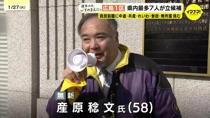 【衆議院選挙】広島1区には7人が立候補を届け出 各候補者の第一声 【広島1区】 2026年1月27日(火) 17:22 国内 無所属・新人 産原稔文氏(58) 「私は、何かの専門家、そういうわけではありませんが、素人目線、庶民目線だから言えることがあるとも思ってます」