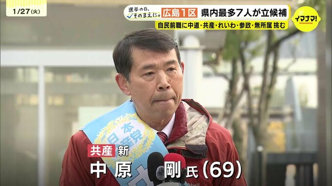 【衆議院選挙】広島1区には7人が立候補を届け出 各候補者の第一声 【広島1区】 2026年1月27日(火) 17:22 国内 日本共産党・新人 中原剛氏(69) 「大企業は大儲け、庶民の暮らしは大赤字、ここに自民党政治のゆがみがあります。台湾有事問題、高市首相が発言して、経済界にも大きな批判の声が起きています。今からでも撤回を求めたいというふうに思います」