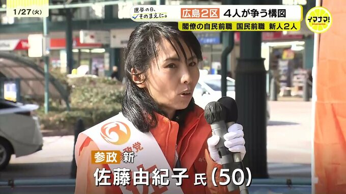 【衆議院選挙】広島2区には4人が立候補を届け出 各区候補者の第一声【広島2区】 2026年1月27日(火) 17:24 国内 参政党・新人 佐藤由紀子氏(50) 「私は外国人土地取得問題を専門分野として訴えていきたい。どうして外国の方に土地を売ってしまうのかというと、年金だけでは生活できない。ただ法整備を整えるということだけでは、この問題は解決しないと思っています」