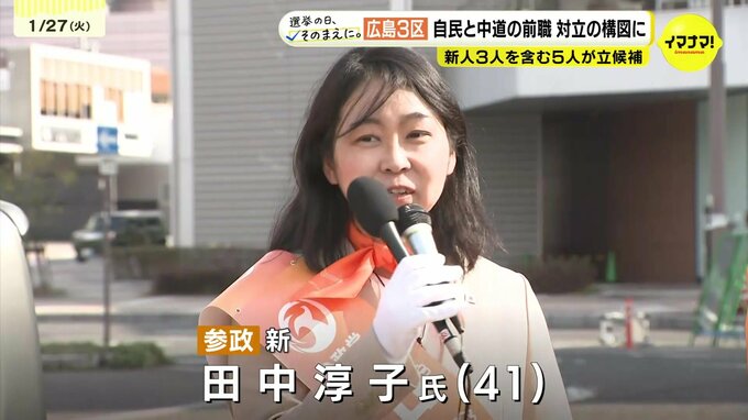 【衆議院選挙】広島3区には5人が立候補を届け出 各候補者の第一声【広島3区】 2026年1月27日(火) 17:28 国内 参政党・新人 田中淳子氏(41) 「第3区は、やはり子育て世代が多いということで、まずは子育てのお父さんお母さんがちょっとでも安心して育児が出来る環境をつくっていくっていうこと。私は命を削る思いで、腹をくくってこの地にやってまいりました」