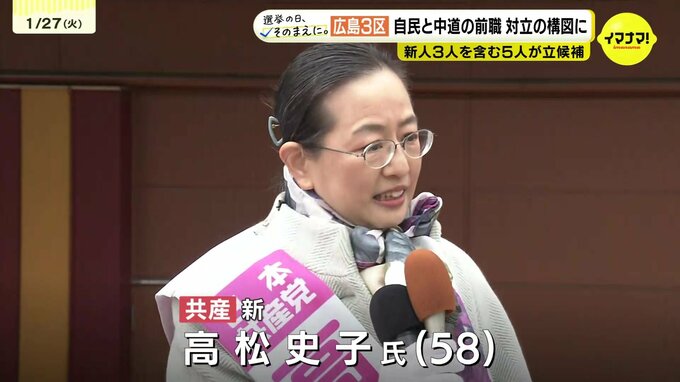 【衆議院選挙】広島3区には5人が立候補を届け出 各候補者の第一声【広島3区】 2026年1月27日(火) 17:28 国内 日本共産党・新人 高松史子氏(58) 「国際社会で日本の信用を落としているこの自民党政権、自民党政治。これは高市政権を退陣に追い込むチャンスです。この広島3区から、金権腐敗政治をただし、暮らし・平和に希望のもてる新しい国会へ」