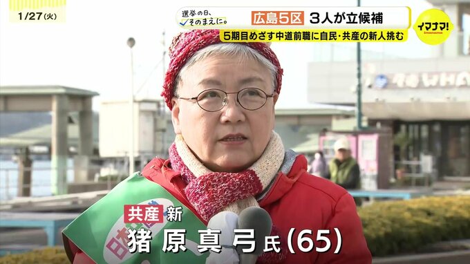 【衆議院選挙】広島5区には3人が立候補を届け出 各候補者の第一声【広島5区】 2026年1月27日(火) 17:33 国内 日本共産党・新人 猪原真弓氏(65) 「国民をとことん苦しめ、平和と民主主義を壊してきた自民党の政治を、今こそ終わらせる時です。核兵器は使ってはいけない。核実験も同じです。アメリカ言いなりの政治をやめる時です」