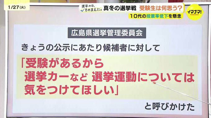 広島県選挙管理委員会ではきょうの公示にあたり、届け出の冒頭、候補者に対して「受験があるから選挙カーなど、選挙運動については気をつけてほしい」という旨の呼びかけを行いました。立候補者の中には、拡声器を使うとき、学校の周りやマンションなどに受験生がいることは、やはり気にするという声もありました。