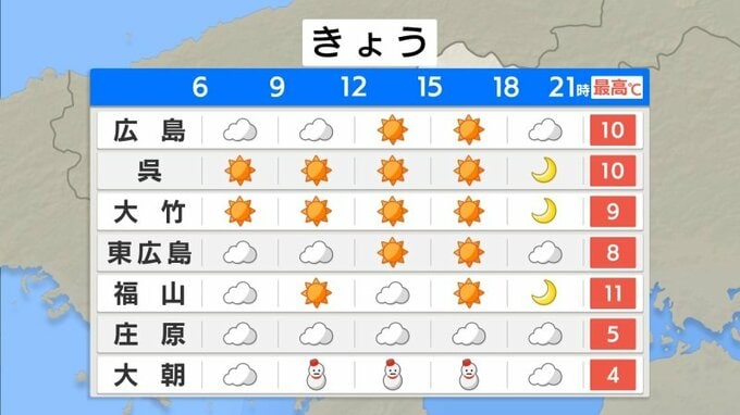 きょう28日(水)の広島県は、この時期らしい朝の冷え込みとなりました。最低気温は、広島市中区2.1℃、福山市-1.8℃、庄原市-3.3℃、東広島市-3.9℃でした。