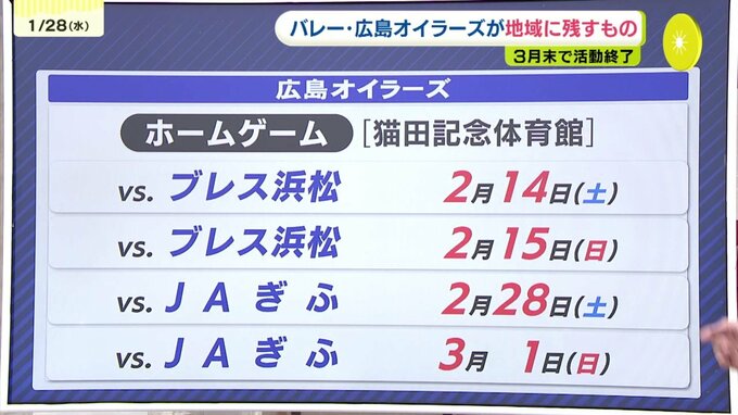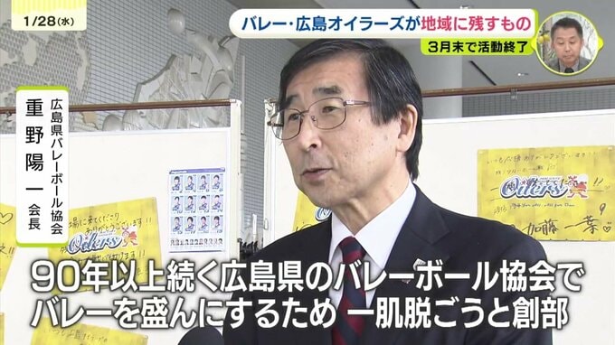 「大野石油が33年前に創部して、広島のバレーを元気にしようと、90年以上続く広島県バレーボール協会ですが、バレーボールを盛んにするためひと肌脱ごうと創部していただいたので感謝しかない。小中高のジュニアの目標になっっていたので、それがなくなることは悲しい。女子の目標になっていたので、寂しいです」
