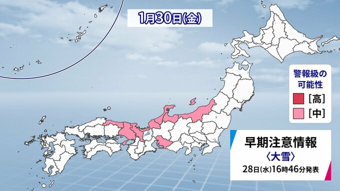 東北地方と東日本から西日本の日本海側を中心に、山沿いや山地だけではなく、平地でも大雪となる所があり、普段雪の少ない東日本から西日本の太平洋側でも大雪となる所があるでしょう。