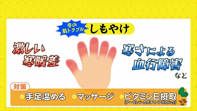 他にも、激しい寒暖差や寒さで血流が悪くなってしまうことにより起こりやすいのが「しもやけ」です。しもやけの対策は、しっかりと温めることが重要です。さらに適度にマッサージをするのもおすすめです。食事としては、アーモンドやカボチャ、アボカドなどビタミンEを摂取することが推奨されています。