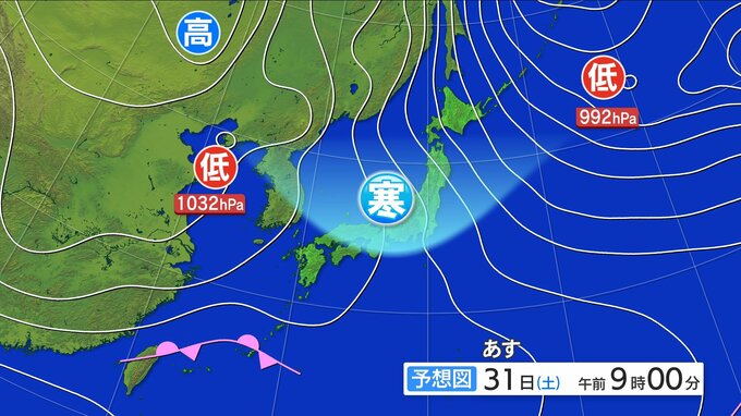 31日(土)上空の寒気の影響で北部は雪がちらつく 南部では晴れ間