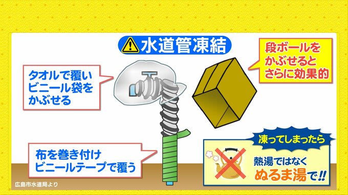 対策としては、露出した部分に布やビニール袋を巻き付け、さらに段ボールなどで覆うとより効果的です。万が一凍結してしまったら、熱湯ではなくぬるま湯をかけるようにしてください。