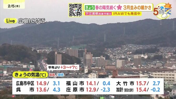 きょう2月5日(木)の広島県内は、午後ほど日差しが届き、春のようなぽかぽか陽気になりました。きょうも引き続き各地3月並の暖かさで、最高気温は、広島市中区で14.9℃ 大竹では15.7℃まで上がりました。