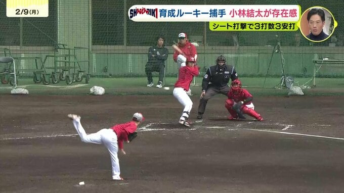 約5000人の観客が訪れた7日の天福球場。春季キャンプ最初のシート打撃には主力選手も参加しましたが、その中で存在感を見せたのが育成ルーキー捕手の小林結太(ゆうた)でした。