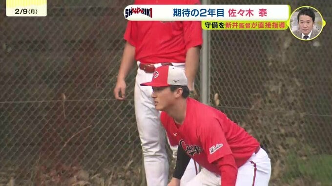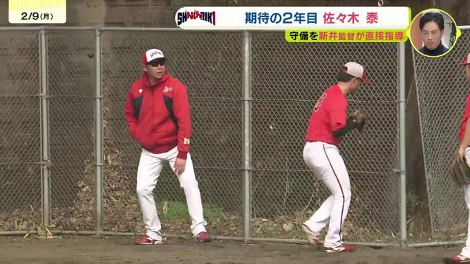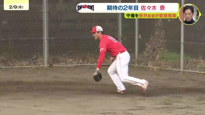 7日、シート打撃終了後、佐々木が取り組んだのは守備。新井監督から直接指導を受ける場面もありました。