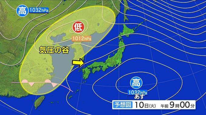 あす10日(火)は、朝の内、高気圧に覆われ日が差す時間もありますが、西から気圧の谷が近付くため、だんだんと天気は下り坂でしょう。昼前から雲が厚くなり、早いところでは昼過ぎから雨が落ちてくる見込みです。夜には広く本降りとなりそうです。朝の冷え込みは強く、きょうと同じくらい厳しい予想ですが、だんだんと上空の寒気が緩むため、日中はきょうよりも5℃程度高い見込みです。夜の冷え込みは小さいでしょう。