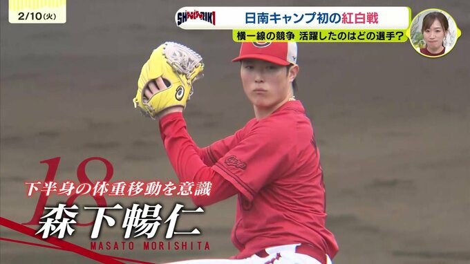 一方、紅組の先発は森下。この春は、下半身の体重移動に重点的に取り組んできました。