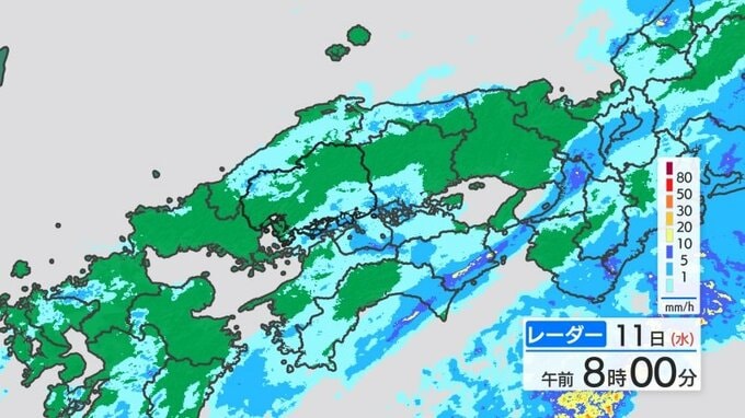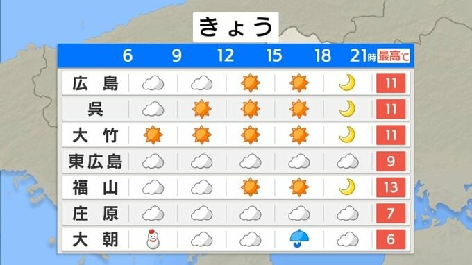 きょう11日(水)朝は、雨が降っているところが多くなっています。上空の寒気は緩んでいて、朝の冷え込みは弱くなりました。最低気温は、広島3.8℃、福山4.4℃、三次0.8℃。きのう-12℃を下回った庄原市高野では、0.3℃までしか下がらず、きのうよりも12℃高くなっています。