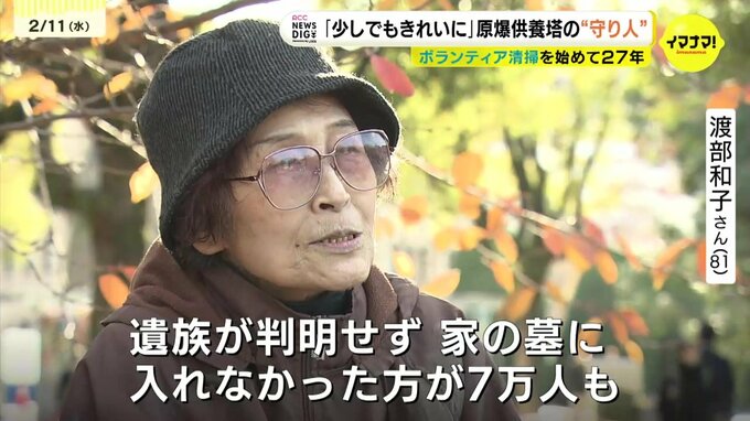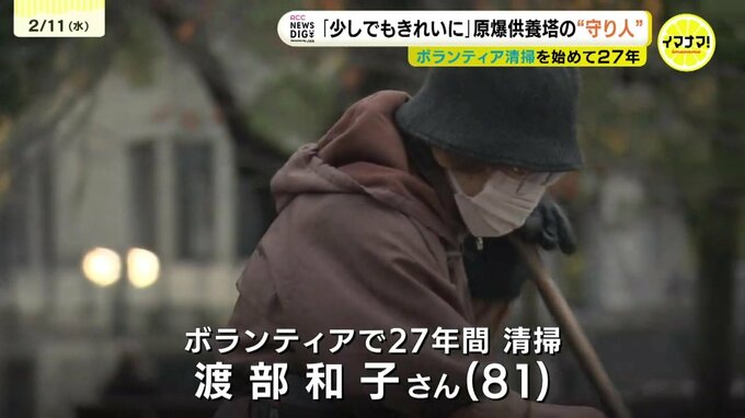広島市の渡部和子さん、81歳。ボランティアで供養塔の清掃を始めて27年になります。毎朝、清掃をするようになってからは約20年。こよみに関わらず、雨の日以外は黙々と、たった1人でそうじをします。