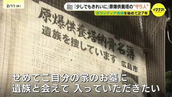渡部さんによると、以前は「原爆で母の遺骨が見つからないのでカーネーションを買ってきました」と供えに来る人もいましたが、いまは供養塔を訪ねてくる遺族はめっきり減ったそうです。渡部さんは核兵器のむごさを伝える供養塔の存在を多くの人に知って欲しいと願っています。