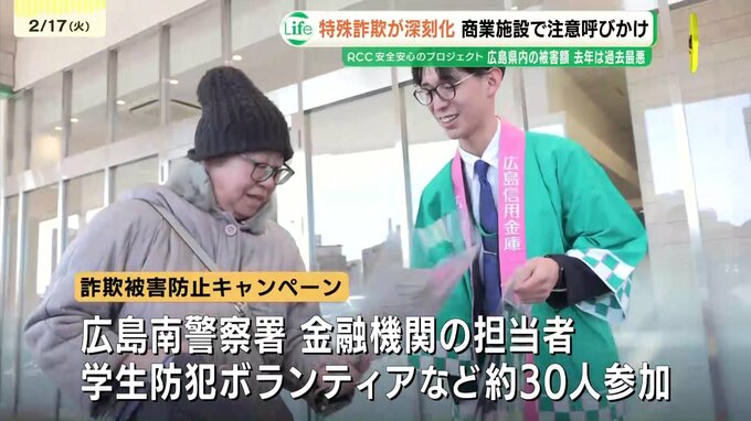 特殊詐欺の被害が深刻化する中、広島市の商業施設で、警察や金融機関などが買い物客に詐欺への注意を呼びかけました。