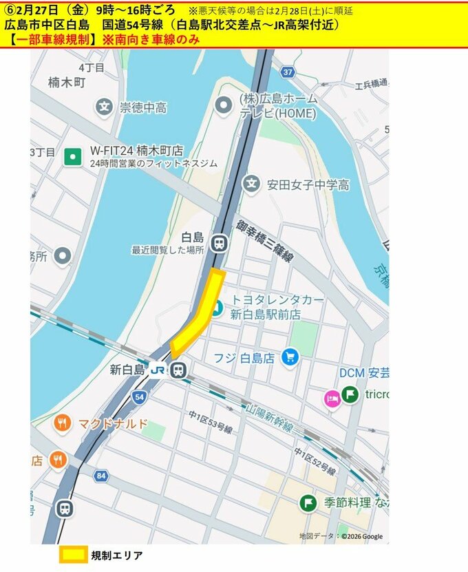 中区白島 国道54号祇園新道 ※南向き車線のみ(一部車線規制)
