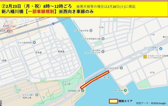 新八幡川橋 広島南道路 ※西向き車線のみ(一部車線規制)