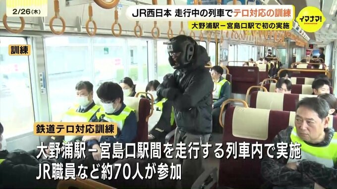 訓練は、大野浦駅から宮島口駅間を走行する列車内で行われ、JR職員などおよそ70人が参加しました。この区間で走行中の列車を使った訓練は初めてです。