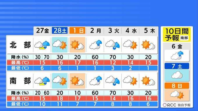 【あす2/27(金)広島天気 】再び天気下り坂 午後は広く傘の出番 風が吹くとひんやり 2026年2月26日(木) 19:50 国内 天気 高温傾向続く 天気は周期変化 この後も周期的な天気変化になるでしょう。週末は天気回復しますが、月曜日の夜から火曜日にかけて再び雨が降る見込みです。日中の気温は、平年より高い傾向が続く予想です。雨上がりは花粉の飛散量が増加するため、しっかりと対策が必要です。