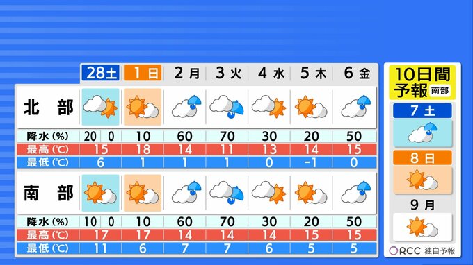 2日(月)は、だんだんと下り坂となり、3日(火)にかけてまとまった雨が降る予想です。4日(水)・5日(木)には日差しが復活するでしょう。来週の半ばは、寒気の影響を受けて気温がこれまでより下がる予想です。山沿いでは崩れると、雪交じりになるでしょう。