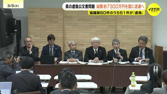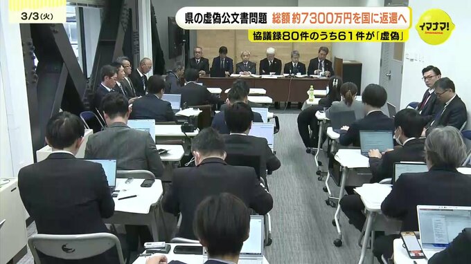 県の調査チームは1次調査の結果について会見し、2018年度から2024年度までに土木建築局が実施した災害復旧事業で5つの建設事務所が作成した協議録、合わせて80件のうち、61件が虚偽のものだったと明らかにしました。また、ファイル名に「嘘」と付けられた協議録3件についても、事実ではないものだったと判定しました。