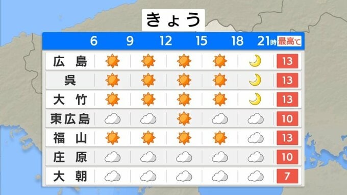 このあとも、西高東低・冬型の気圧配置となり、雲が多い1日でしょう。南部では日差しが届いてきますが、北部ほどぽつぽつと雨が残る見込みです。最高気温は広島・呉・福山13℃、庄原10℃の予想です。北風が強まり、数字以上に寒く感じられそうです。暖かくしてお過ごしください。また、雨上がりで花粉の飛散が多く、「極めて多い」予想です。対策をしてお過ごしください。