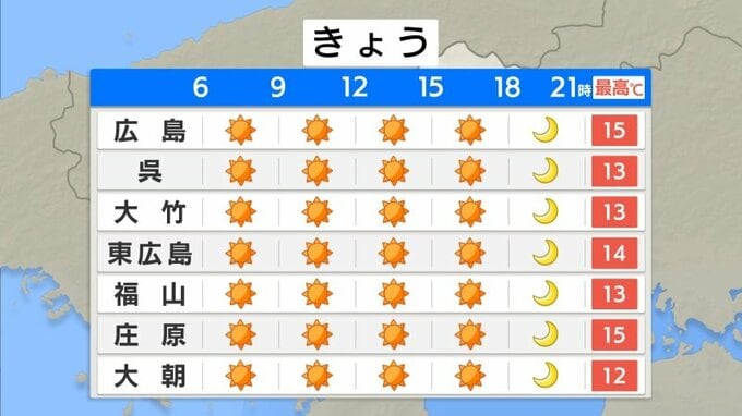 この後もよく晴れて、空気が乾燥するでしょう。日差しが届き、日中は気温が上昇します。最高気温は、広島・庄原15℃、呉・福山で13℃の予想です。スギ花粉がピークとなっています。きょうも県内では1番高いレベルの「極めて多い」予想です。花粉症の方は対策をしてお過ごしください。