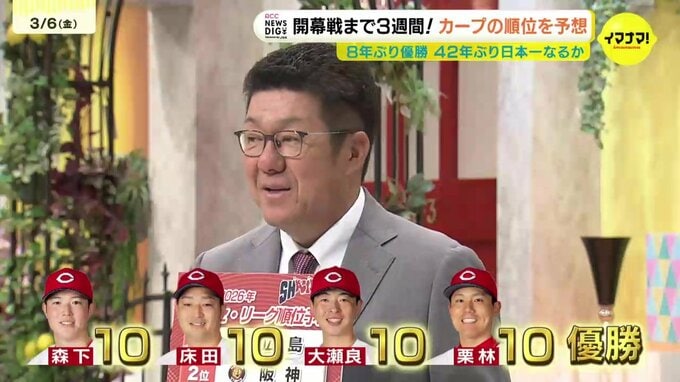 「天谷が言うように条件を付きで。野手となればその、平川蓮選手・佐々木泰選手・中村奨成選手、そういう若い選手が本当に1年間レギュラーとして活躍して。ピッチャー陣の中で、森下暢仁投手・床田寛樹投手っていうの二人がまず10勝以上するというのが条件ですし。そこに大瀬良大地投手と栗林良吏投手が10勝できれば、4人10勝できればもう優勝です。