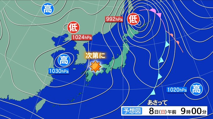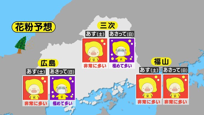 【3/7・8(土日)広島天気】北部ではポツポツ雨や雪 南部では日差し スギ花粉ピークに 2026年3月6日(金) 19:19 国内 天気 8日(日)次第に日差しが届く 花粉に注意 あさって8日(日)は、大陸からの高気圧がやや張り出し、北部ではだんだんと晴れ間が広がる見込みです。南部では、晴れたりくもったりでしょう。土日は花粉が多い予想ですが、あすよりもあさっての方が多く飛びそうです。